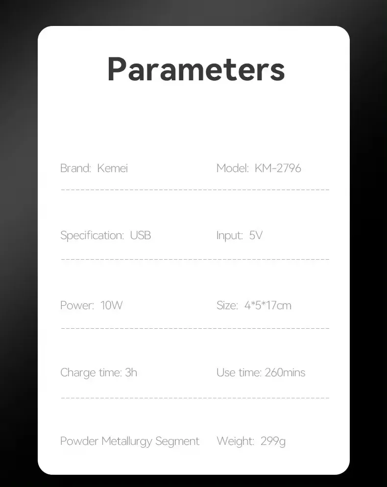 Brushless Motor : The hair trimmer is equipped with a brushless motor, which provides stable and long-lasting performance. This motor type is known for its high efficiency, low noise, and durability.