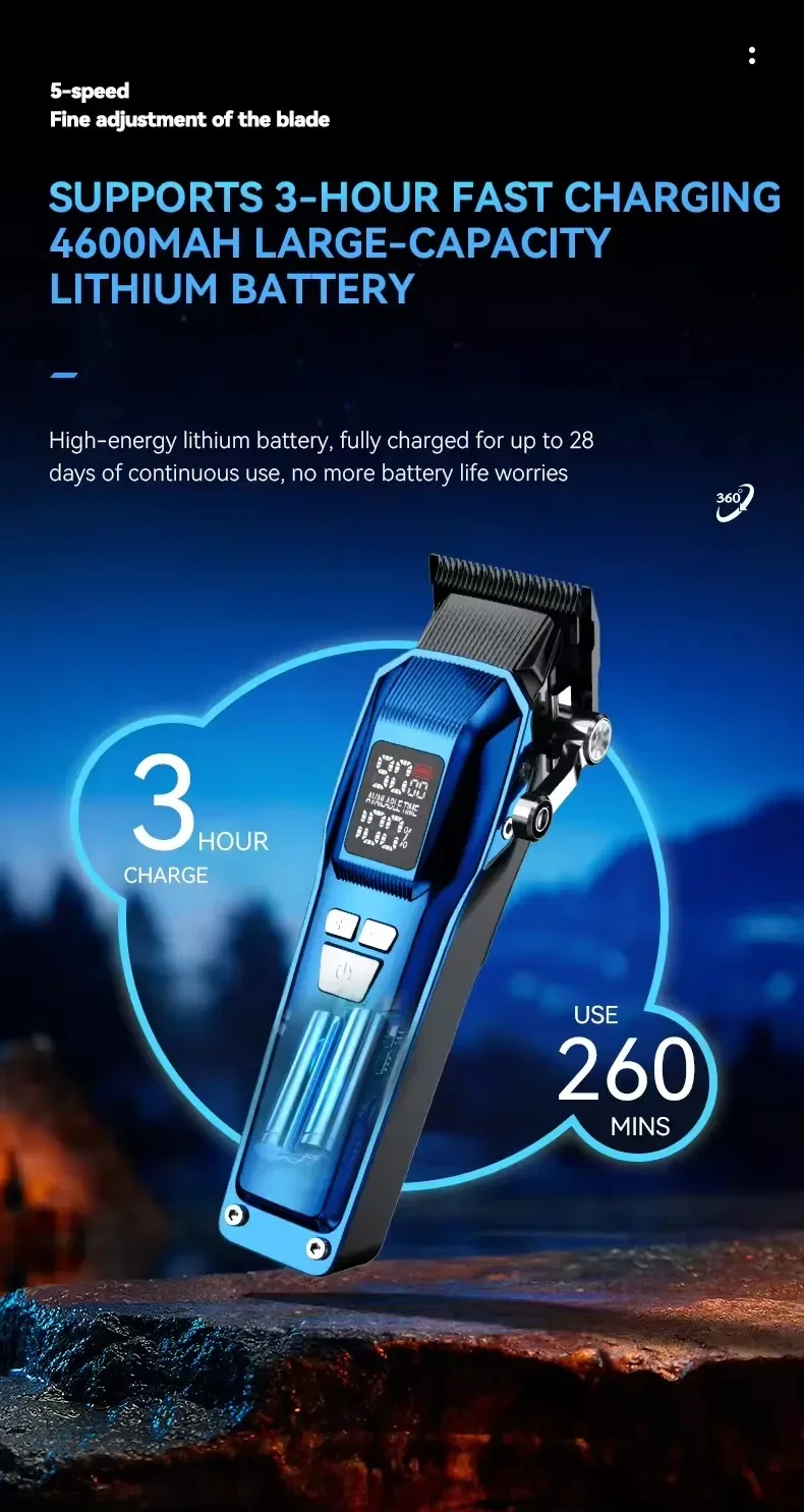 4600mAh Large Capacity Battery : The trimmer is powered by a 4600mAh battery, which provides ample runtime for continuous use. This large capacity battery ensures that you can complete multiple haircuts without needing to recharge.