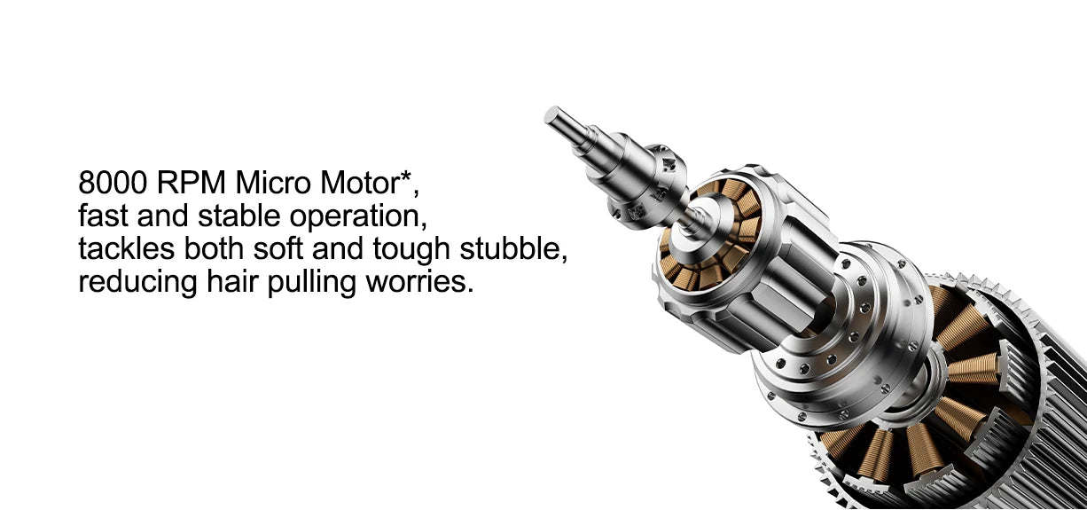 8000 RPM Micro Motor*, fast and stable operation, tackles both soft and tough stubble, reducing hair pulling worries.