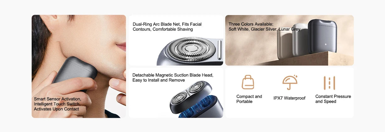Available in three stylish colors – Soft White, Glacier Silver, and Lunar Grey – the XIAOMI MIJIA S200 Electric Shaver caters to different preferences and adds a touch of elegance to your grooming routine. Whether you're at home or on the road, this electric shaver is the perfect companion for a smooth and stylish look.